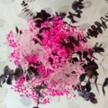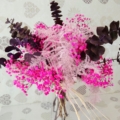 Ramo de flores preservadas y secas formado por paniculata fucsia, esparraguera seca en color rosa y eucalipto morado preservados.